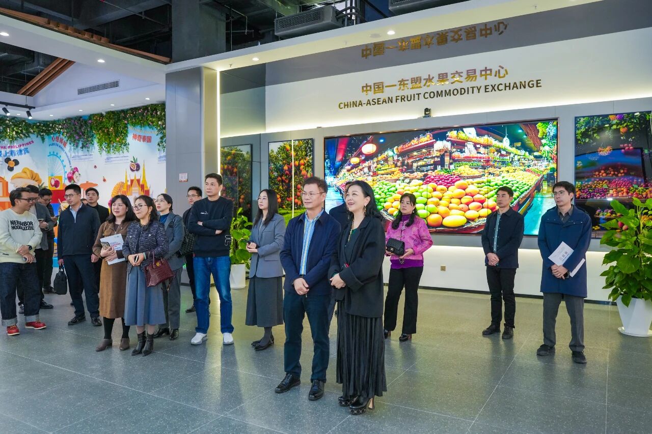 初冬時(shí)節(jié),碧空萬里。2025年11月21日,中國食品藥品企業(yè)質(zhì)量安全促進(jìn)會(huì)廣西代表處一行蒞臨中國—東盟特色商品匯聚中心(簡稱“匯聚中心”)和中國—東盟水果交易中心(簡稱“水果交易中心”)參觀調(diào)研并座談交流。廣西新中產(chǎn)業(yè)投資有限公司、中國—東盟特色商品匯聚中心董事長趙海燕熱情接待。